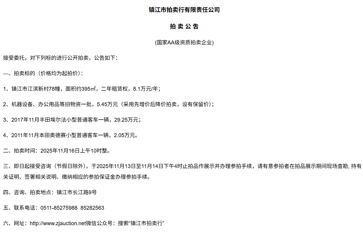 鎮江市拍賣行有限責任公司拍 租 公 吿(國家AA級資質拍賣企業)接受委托,對下列標的進行公開拍租(三拍),公告如下:—、拍租標的(以下價格均為半年至3年租賃權起拍價):1.  建行揚中豐裕支行營業網點二、三、四層經營用房(揚中市三茅鎮三豐南路5號),租賃面積約1080㎡,每層面積約360㎡,三拍底價11.98萬/年(0.3元/平方米/天)。2.  建行揚中油坊支行營業網點三、四層經營用房(揚中市油坊鎮太陽路129號),租賃面積約590㎡,每層面積約295㎡,三拍底價5.34萬/年(0.25元/平方米/天)。3. 建行揚中八橋支行營業網點三、四層經營用房(揚中市八橋鎮太平北路29號),租賃  面積約400㎡,三層約185㎡,四層約215㎡,三拍底價4.43萬/年(0.25元/平方米/天)。以上3套房產均可分層部分出租,拍租價=拍租面積*每平方米每天的租賃單價4. 建行鎮江團山路支行營業網點一層經營用房(鎮江市檀山路8號60幢102、103室),租賃面積約597.09㎡,三拍底價34.52萬/年。5. 建行丹陽原賢橋分理處營業用房(丹陽市城河路15-21號),租賃面積約93.88㎡,二拍底價7.16萬/年。二、拍租時間:2025年11月23日上午10時整。三、即日起接受咨詢(節假日除外)。于11月17日至11月21日下午4時止拍品作展示并辦理參拍手續,請有意參拍者在拍品展示期間現場查勘,持有關證明、簽署相關說明、繳納相應的參拍保證金辦理參拍手續。四、咨詢、拍租地點:鎮江市長江路9號五、聯系方式:0511-85275988   13655299933楊先生六、網址:http://www_zjauction_net.gugaomarine.com;微信公眾號:搜索“鎮江市拍賣行” 拍品清單2025.11.23序號名稱起拍價(元)標的說明1建行揚中豐裕支行營業網點二、三、四層經營用房(揚中市三茅鎮三豐南路5號),租賃面積約1080㎡,每層面積約360㎡三拍底價11.98萬/年(0.3元/平方米/天)1、1-3號房產均可分層部分出租,拍租價=拍租面積*每平方米每天的租賃單價;2、意向競拍人在拍賣前需持營業執照或身份證與委托方說明租賃房產經營業態,確定意向后出具房產承租用途承諾書,經委托方審核后,方可交納保證金參加競拍;3、租賃期限為半年至3年(承租方與出租方協商而定),承租方每半年或一年結付租金,租賃期間的水、電費用及其它相關費用均由承租方承擔;4、承租方不得用于經營和保管危險物品,不得用于開設餐飲、娛樂等可能嚴重影響消防安全、運營安全的經營業態,不得用于經營委托貸款、小額貸款等可能冒用委托方名義,帶來聲譽風險的經營業態。租賃期內,承租方不得破壞墻體結構,自行成就消防、安全等使用條件,不得擅自將租賃房屋轉租、轉讓給他人使用,否則委托方有權收回房屋;5、拍租成交后,承租方將租金交至出租方指定賬戶,傭金交至拍賣方賬戶(拍租傭金為該房屋一個月租金)。承租方憑租賃合同無息退還保證金。2建行揚中油坊支行營業網點三、四層經營用房(揚中市油坊鎮太陽路129號),租賃面積約590㎡,每層面積約295㎡三拍底價5.34萬/年(0.25元/平方米/天)3建行揚中八橋支行營業網點三、四層經營用房(揚中市八橋鎮太平北路29號),租賃面積約490㎡,每層面積約245㎡三拍底價4.43萬/年(0.25元/平方米/天)4建行鎮江團山路支行營業網點一層經營用房(鎮江市檀山路8號60幢102、103室),建筑面積約597.09㎡三拍底價34.52萬/年5建行丹陽原賢橋分理處營業用房(丹陽市城河路15-21號),建筑面積約93.88㎡二拍底價7.16萬/年